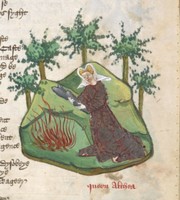 Londra, British Library, Harley 1766, f. 63r. La regina Altea estrae un tizzone dal fuoco per salvare la vita del figlio Meleagro.