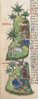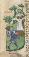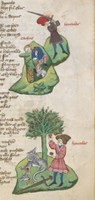 Londra, British Library, Harley 1766, f. 83r. Tre donne della Tracia colpiscono Orfeo. Due volpi con le code annodate ad una torcia accesa; Sansone uccide i Filistei con la mandibola di un asino; Sansone scardina la porta della città di Gaza.