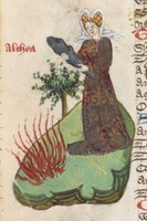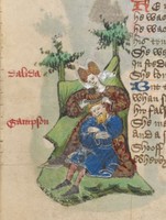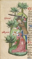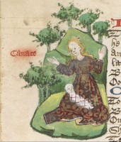 Londra, British Library, Harley 1766, f. 89v. Canace siede con il figlio in grembo.