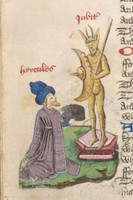 Londra, British Library, Harley 1766, f. 67v. Ercole inginocchiato offre il sangue di Busiride ad una statua di Zeus.