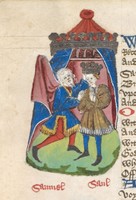 Londra, British Library, Harley 1766, f. 83v. Dalila taglia i capelli di Sansone mentre questi è addormentato.