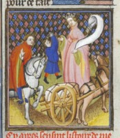 Bruxelles, Koninklijke Bibliotheek van België, 9509, f. 96r. La vestale Claudia impedisce che suo padre venga gettato giù dal carro trionfale.