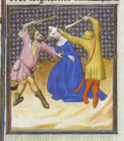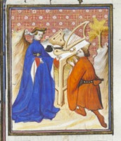 Bruxelles, Koninklijke Bibliotheek van België, 9509, f. 77v. Atalia, regina di Gerusalemme, ordina il massacro di tutti i discendenti maschi della stirpe di David; Atalia viene lapidata da due uomini.