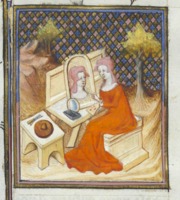 Bruxelles, Koninklijke Bibliotheek van België, 9509, f. 101v. Marzia si fa un autoritratto seduta dinanzi ad uno specchio.