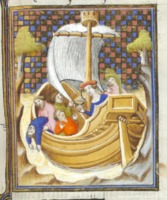 Bruxelles, Koninklijke Bibliotheek van België, 9509, f. 49v. Paride si avvicina in nave alla città di Sparta, dove si trova Elena all'interno di un palazzo.
