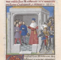 Londra, British Library, Add. 35321, f. 314v. Gli abitanti di Firenze invitano Gualtieri di Brienne ad assumere il governo della città; alcuni soldati attendono all'esterno del palazzo.
