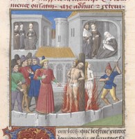 Londra, British Library, Add. 35321, f. 309v. Filippo il Bello, accompagnato da tre giudici, fa ardere i cavalieri Templari sul rogo.