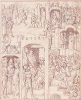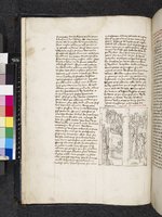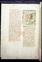 Londra, British Library, Harley 621, f. 9v. Laio ordina la morte di Edipo e lo affida ad un servitore, che appende il bambino ad un albero per i piedi; Edipo viene salvato da un pastore e affidato a Polibo; Edipo consulta l'oracolo, uccide Laio e affronta la sfinge; Edipo sposa Giocasta e regna su Tebe; gli eserciti di Eteocle e Polinice si affrontano.