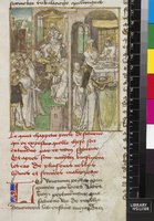Londra, British Library, Harley 621, f. 11v. Tieste abbraccia Europa e viene cacciato da Micene; durante un banchetto Atreo fa servire a Tieste i corpi dei suoi figli; Egisto uccide Atreo.