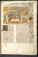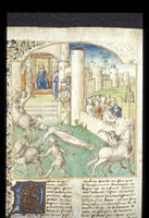 Londra, British Library, Harley 621, f. 274r. Ottaviano ordina l'uccisione di Marco Antonio, catturato mentre cerca riparo presso una statua di Giulio Cesare; Cassio Parmense viene ucciso mentre prega in un tempio dinanzi un'altra statua di Cesare; Giulia viene esiliata dalla città; due uomini armati avanzano verso Agrippa, figlio di Giulia, la quale giace ebbra in un prato.