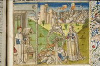 Londra, British Library, Harley 621, f. 369v. Brunichilde viene legata ai cavalli e squartata per ordine di Clotario, che siede nella sala del trono all'interno della città; Maometto, all'esterno della città, predica ad una folla seduta dinanzi a lui sul prato.
