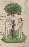 Londra, British Library, Harley 1766, f. 11r. Adamo ed Eva,tentati dal serpente, mangiano il frutto proibito.