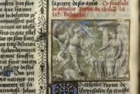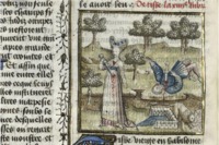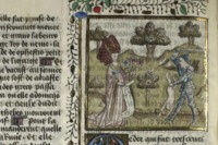 Chantilly, Bibliothèque du Château de Chantilly, 856, f. 46v. Medea, reggendo un mazzo di fiori ed una pergamena tra le mani, assiste mentre Giasone uccide il giovane Apsirto.
