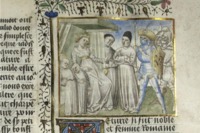 Chantilly, Bibliothèque du Château de Chantilly, 856, f. 32r. L'autore Giovanni Boccaccio offre il libro alla contessa d'Altavilla, circondata dal suo seguito.