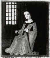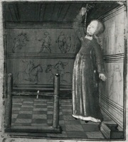 Dresda, Sächsische Landesbibliothek, F 171 b, f. 19v. Ipermestra seduta sul trono; sulla destra all'interno di una torre attraverso una finestra chiusa da una grata si scorge la figura di un uomo.