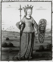 Dresda, Sächsische Landesbibliothek, F 171 b, f. 7r. Semiramide siede sul trono vestita in armatura con una spada e uno scudo.