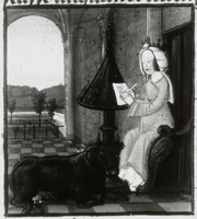 Dresda, Sächsische Landesbibliothek, F 171 b, f. 14v. Iside scrive seduta ad un leggio , ai suoi piedi è stesa una mucca.