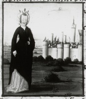 Dresda, Sächsische Landesbibliothek, F 171 b, f. 16v. La regina Libia sta dinanzi alle mura di un castello.