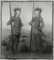 Dresda, Sächsische Landesbibliothek, F 171 b, f. 17r. Marpesia e Lampedone, regine delle Amazzoni, armate con spade e lance.