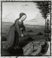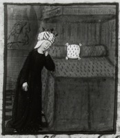 Dresda, Sächsische Landesbibliothek, F 171 b, f. 21v. Niobe, in ginocchio accanto a un letto, piange la morte dei figli.