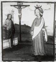 Dresda, Sächsische Landesbibliothek, F 171 b, f. 26v. La sibilla Eritrea annuncia la resurrezione di Cristo, raffigurato sia sulla croce sia mentre emerge dal sepolcro.
