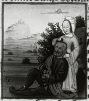 Dresda, Sächsische Landesbibliothek, F 171 b, f. 28r. Iole seduce Ercole, il quale è seduto in un prato.