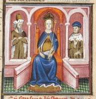 Londra, British Library, Royal 20 C V, f. 8v. Semiramide è seduta in trono armata di spada, al suo cospetto vi sono il figlio Ninia e un gruppo di soldati.