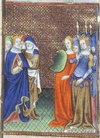 Londra, British Library, Royal 20 C V, f. 29r. Medea, seduta sul trono con una pergamena tra le mani, ordina ad un soldato di uccidere il figlio avuto con Giasone, il quale sopraggiunge a cavallo sulla sinistra.
