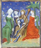 Londra, British Library, Royal 20 C V, f. 5r. L'autore Giovanni Boccaccio siede in cattedra dinanzi a un leggio su cui sono posati dei libri; Boccaccio presenta il libro ad Andrea Acciaiuoli; Semiramide riceve da un messo la notizia della caduta di Babilonia; una regina guida un gruppo di nobildonne che suonano degli strumenti sedute in un prato.