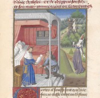 Londra, British Library, Add. 35321, f. 11r. Mentre Giocasta giace ancora nel letto, Laio affida Edipo appena nato ad un pastore; il pastore appende Edipo ad un albero per i piedi; Giocasta compie il suicidio.