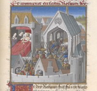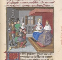 Londra, British Library, Add. 35321, f. 22r. Paride ed Elena, scortati da alcuni soldati, si presentano al cospetto di Priamo ed Ecuba seduti sul trono.