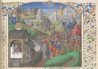 Londra, British Library, Add. 35321, f. 64r. Mezio Fufezio sconfigge Tullo Ostilio, mentre i rispettivi eserciti osservano lo scontro.