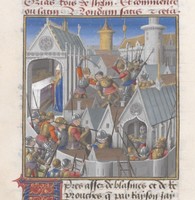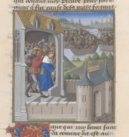 Londra, British Library, Add. 35321, f. 59v. Il figlio di Creso interviene per salvare la vita del padre, che sta per essere decapitato da un soldato persiano; Creso viene legato ad un palo e dato alle fiamme.
