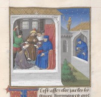 Londra, British Library, Add. 35321, f. 107v. L'autore Giovanni Boccaccio, in piedi accanto ad un leggio e una scrivania, indica una folla di derelitti all'altro capo della stanza.