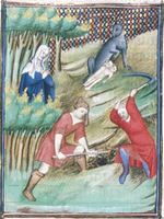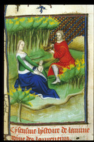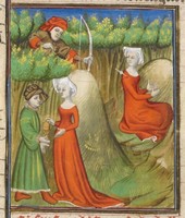 Londra, British Library, Royal 20 C V, f. 42r. Cefalo dona una coppa d'oro a Procri; nella foresta Procri viene ferita mortalmente dalla freccia scagliata dal marito.