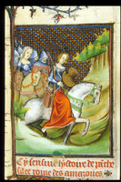 Londra, British Library, Royal 20 C V, f. 49r. La regina Pentesilea a cavallo guida un esercito di Amazzoni in battaglia.