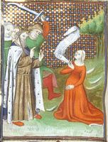 Londra, British Library, Royal 20 C V, f. 49v. Neottolemo solleva la spada per uccidere Polissena, la quale è inginocchiata in preghiera sulla tomba di Achille.