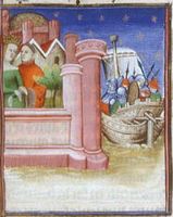 Londra, British Library, Royal 20 C V, f. 54r. Elena e Paride si trovano all'interno delle mura di Troia, mentre una nave della flotta greca si avvicina alla città.