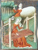 Londra, British Library, Royal 20 C V, f. 72v. Panfila raccoglie la seta; Panfila tesse un panno al telaio con le fibre raccolte.