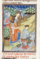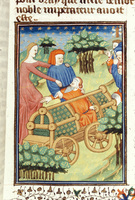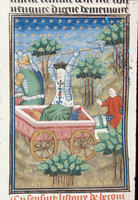 Londra, British Library, Royal 16 G V, f. 86v. Beronice sul carro da guerra mette in fuga degli uomini armati.