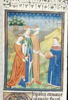 Londra, British Library, Royal 16 G V, f. 66r. Il padre di Megulia Dotata versa la dote per la figlia al padre dello sposo.