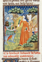 Londra, British Library, Royal 16 G V, f. 76v. Virginia viene assalita da un gruppo di uomini nel tempio della Pudicizia.