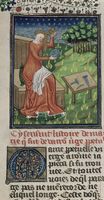 Londra, British Library, Royal 16 G V, f. 57r. Saffo, seduta in cattedra, legge un volume a due uomini e una donna.