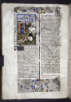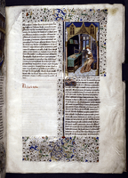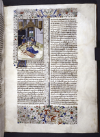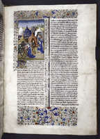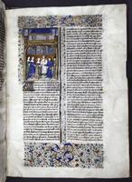 New York, Public Library, Spencer 33, f. 28r. Atalia, regina di Gerusalemme, ordina il massacro di tutti i discendenti maschi della stirpe di David; Ioas viene incoronato re di Giuda da due vescovi; tre cittadini osservano il corpo di Atalia venire trascinato per i capelli fuori dai cancelli della città.