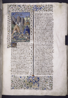 New York, Public Library, Spencer 33, f. 43r. Beronice avanza su un carro calpestando il corpo di Ceneo; all'interno di una stanza Beronice piange sul corpo del figlio.