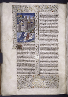 New York, Public Library, Spencer 33, f. 31v. Artemisia fa erigere un monumento funebre in onore del defunto marito; Artemisia guida l'esercito contro i soldati di Rodi che stanno sbarcando ad Alicarnasso.