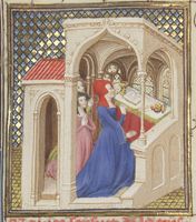 Parigi, Bibliothèque Nationale de France, Fr. 12420, f. 97r. Virginia prega nel tempio della Pudicizia dinanzi alla nuova statua della dea.