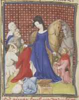 Parigi, Bibliothèque Nationale de France, Fr. 12420, f. 103v. Armonia assiste all'uccisione della giovane schiava che ha preso il suo posto, quindi si consegna ai sicari mandati per ucciderla.