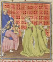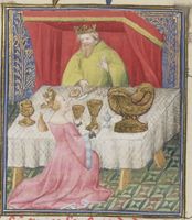 Parigi, Bibliothèque Nationale de France, Fr. 12420, f. 114r. Dripertua serve a tavola il padre Mitridate.