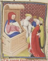 Parigi, Bibliothèque Nationale de France, Fr. 12420, f. 113r. Terza Emilia scopre e perdona il tradimento del marito Scipione con una giovane serva.